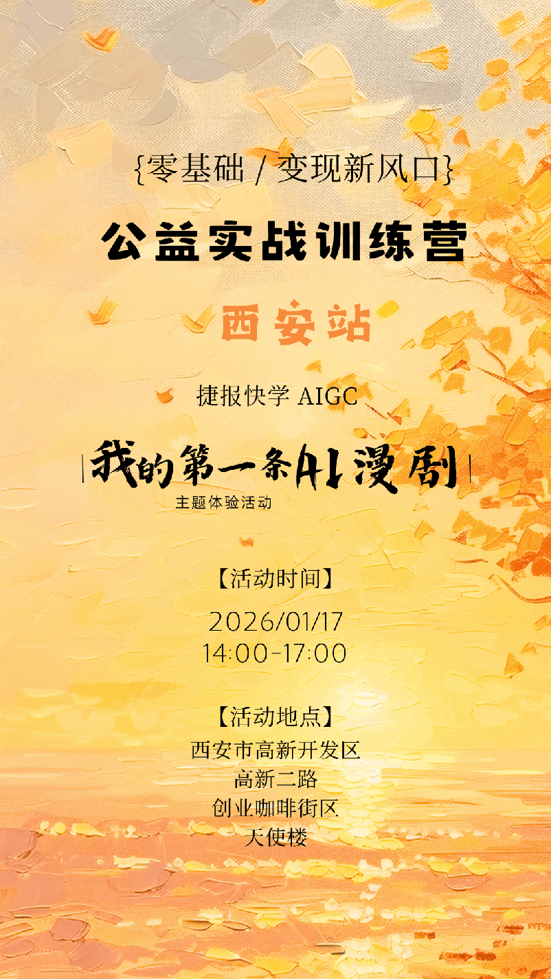 本次公益锻炼营将于2026年1月中旬正在西安高新开辟区开班,详情征询对接捷报快学公号。努力于让每小我都能用AI讲好本人的故事、抓住内容盈利。就是为大师免费奉上这把钥匙。“我的第一条AI漫剧”公益锻炼营将连续落地全国多个城市,输出可间接用于平台分发分账的漫剧成片。抖音单平台漫剧付费日均GMV超1000万,成熟的果实 —— 正在导师指点下完成画面合成取节拍优化,既能激活当地创意资本,即可免费你的AI漫剧创做之旅。无需任何绘画、动画或编剧根本,也让通俗创做者望而却步。通过AI大模子东西链,确保每位都能获得个性化指点。
